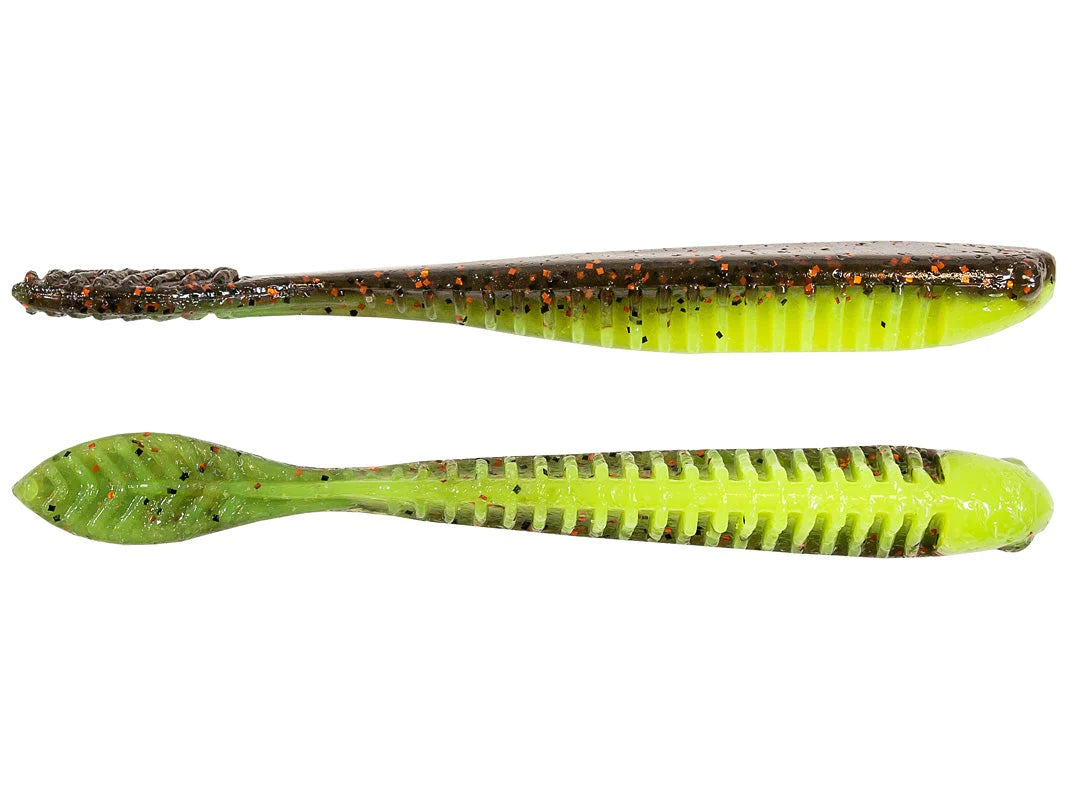 Thanks to their remarkably soft, pliable, buoyant, and 10X Tough ElaZtech construction, 3.5" and 4.2" Trick ShotZ--Z-Man's first specifically designed drop shot baits--feature limber, ribbed bodies and spade-shaped tails that produce ultra-lifelike action with little rod movement, and are impregnated with salt for taste and texture. Accurately mimicking a variety of forage including shad, leeches, gobies, and minnows, their ElaZtech makeup provides exceptional tear resistance when nose hooked and facilitates a more natural, tail-up position that won't sink to the bottom on slack line like other competitive products.
