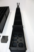 This unit fits the 21-C VEXUS® VX20/21 center compartment. The center organizer holds 12 - 3700 series tackle boxes and comes with a pair of soft plastics sides. The kit also comes with 2 Spinnerbait/crankbait racks and 2 spare reel holders. It is anchored front and back to the factory installed brackets.