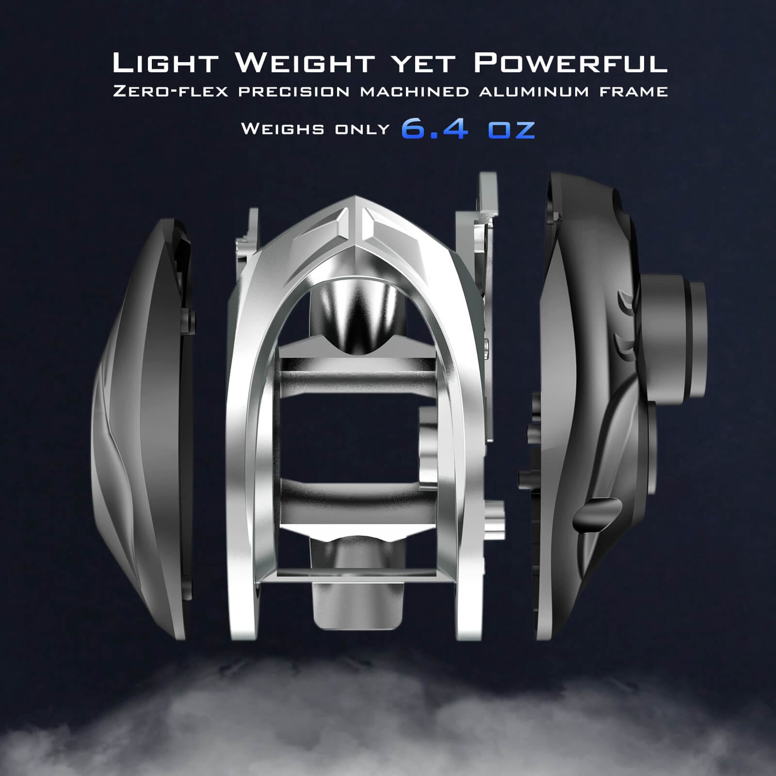 KastKing put their best features in this baitcast reel – precision DigiCut 7075 aerospace aluminum main gears hardened to Rockwell Hardness 80, manganese brass pinion gears for increased durability, 7.2:1 and high speed 9.1:1 gear ratios cover many fishing techniques, short main shaft with super-spin bearings for faster spool speed and great casting distance, 17.6 lb triple carbon disc drag. Serious anglers will appreciate the Affordable Innovation in this KastKing reel!
