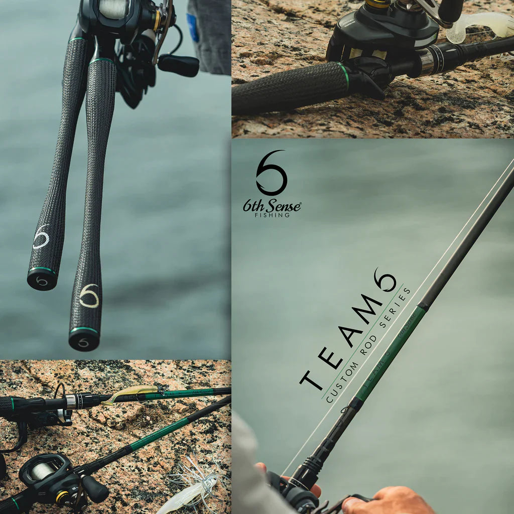 The Team 6 Rod Series offers a full, woven carbon fiber, custom handle designed for maximum sensitivity. The shape of this handle will fit in your hands like a glove, allow you to feel even the lightest of bites, and provide plenty of leverage for those long casts.