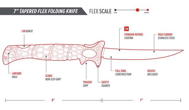 Unfold perfection with our 7” Tapered Flex Folding Knife. Derived from our iconic 7” Tapered Flex, the NEW 7” Tapered Flex Folding Knife is designed for anglers who live a lifestyle of adventure and require a highly portable folding fillet knife that is built to last a lifetime while being versatile enough to handle any salt or freshwater fish. Whether you want to keep it in your pocket, in your tackle box, or on the boat, this knife easily folds down for effortless storage. The 7” Tapered Flex Folding Knife features our signature Bubba non-slip grip with a titanium-nitride coated, high carbon stainless steel blade that has the same flex as our 7” Tapered Flex. It is built with a premium lockback mechanism for a strong hold during use. This 7” Tapered Flex Folding Knife also comes with a sheath and lanyard hole for added security.