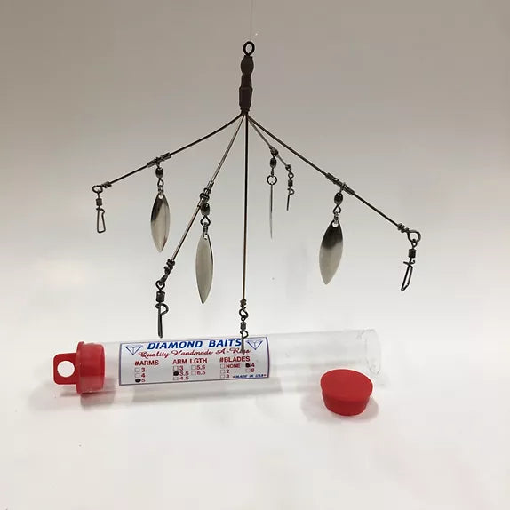 Five 3 1/2 “ arms and 4 blades. With a 220lb head swivel and 75 lb bait swivels the compact rig can handle big fish and is light enough to throw all day. Recommended bait size is 2.8 to 3.5. This A-rig is equipped the quick change snap swivels,with one hand hold the end of the snap and place the hook eye over the end of the coil and rotate half turn. “Snap does not open”! Quick and dependable . Comes with a reusable rig tube to keep your bait stored in when not using.