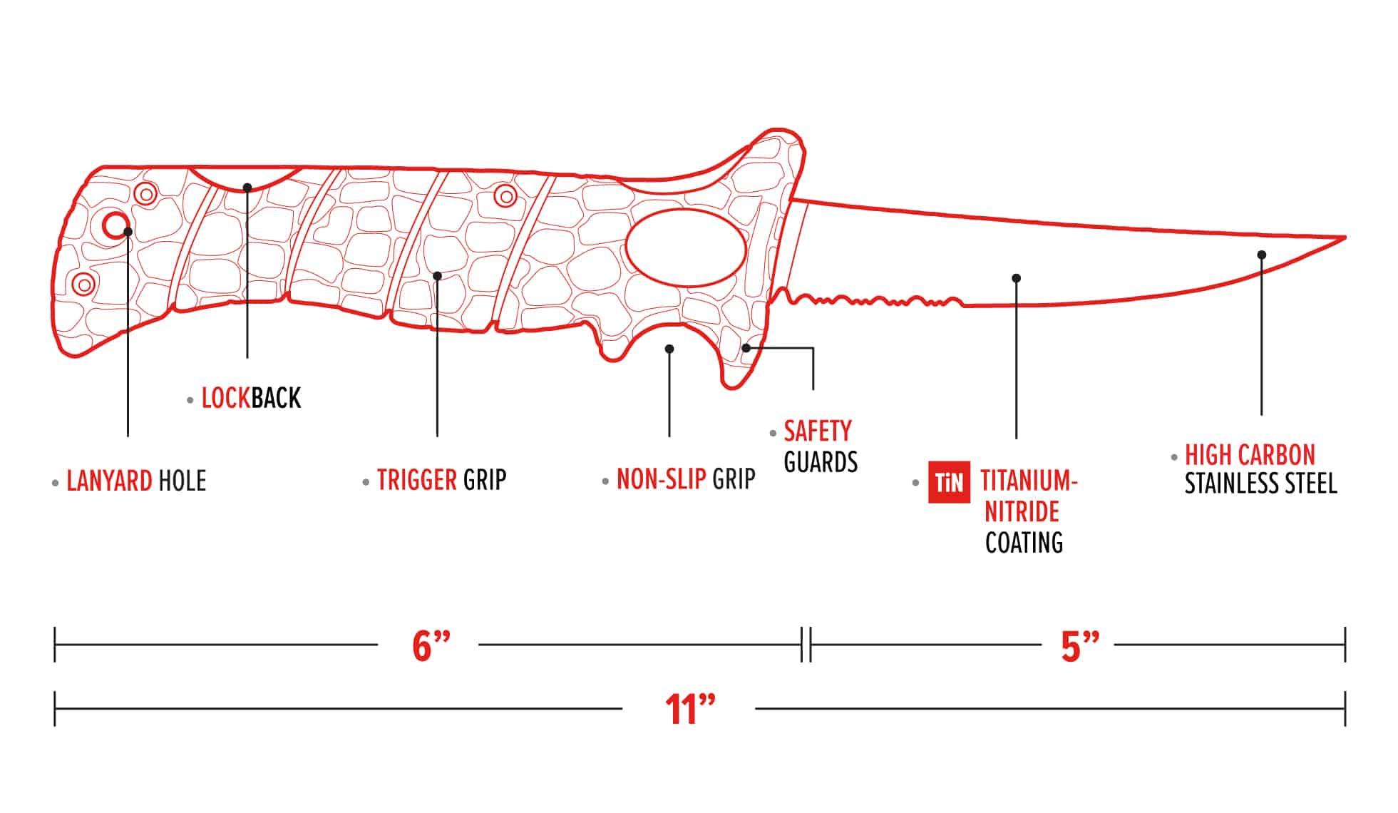 Every fisherman needs this folding fillet knife as their good luck charm. You will want this with you wherever you go. Its folding abilities make it easy to store and quick to access. Its 5-inch Teflon coated and titanium bonded and secure lock-back design keeps it safe and user-friendly. It has a 1.5-inch serrated cutting edge and its 6-inch famous red non-slip-grip handle. This full tang constructed knife is excellent for your everyday fishing trips. If you are not sure what you will catch, this knife is handy to have for whatever comes your way.
