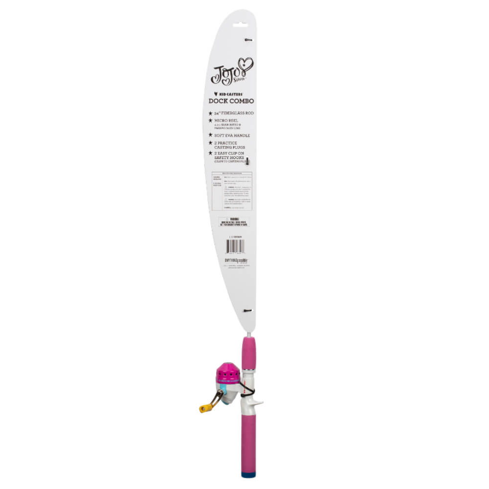 The Kid Casters JoJo Siwa Dock Combo is a great setup for young anglers! With its 34″ fiberglass rod with downsized EVA grips that are perfect for small hands. This combo is easy to use and fun to cast! The Kid Casters JoJo Siwa Dock Combo features a 4.1:1 gear ratio micro spincast reel that comes ready to fish with 6lb line. The Kid Casters JoJo Siwa Dock Combo includes a heart shaped practice casting plug and bow bobber.