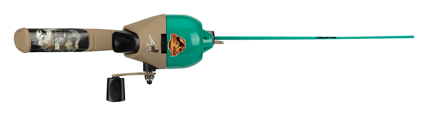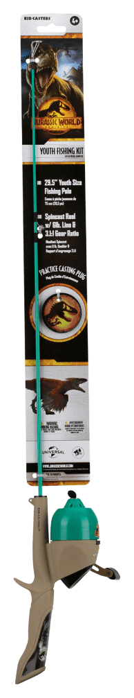Treat your little one to an exciting prehistoric adventure with the Kid Casters® Jurassic World Youth Spincast Combo. This complete fishing kit makes being on the water more fun than ever! It's built around a sleek all-in-one spincast rod-and-reel setup with cool Jurassic World graphics. The spincast reel has a 3.1:1 gear ratio and a large easy-to-use push button, and comes pre-spooled with strong 6-lb. fishing line. The 29.5" fiberglass rod has a light action, perfect for landing fish. Includes a practice casting plug.